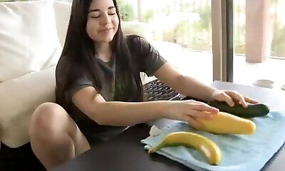 Unexperienced Fucks Her Big Udders and Tight Pussy with a Cucumber