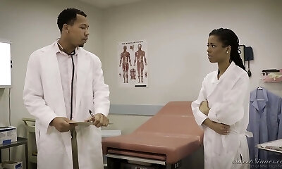 Beautiful doctor Kira Noir entices her tall colleague to be fucked in the hospital