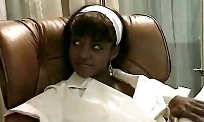 Bosomy black head is horny nurse who wanna expose her bald rosy slit