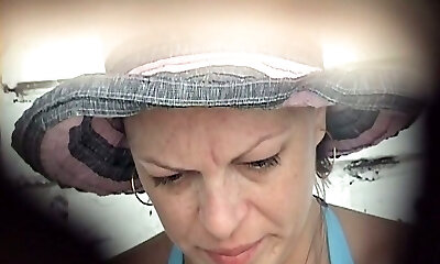 Mature white lady in blue bikini pisses in the public rest room apartment on the beach