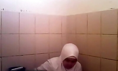 Arab nymph goes pee in a public toilet