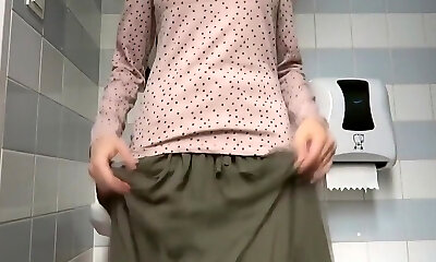 Fine young super hot brunette girl in splendid skirt urinating in the public toiletroom