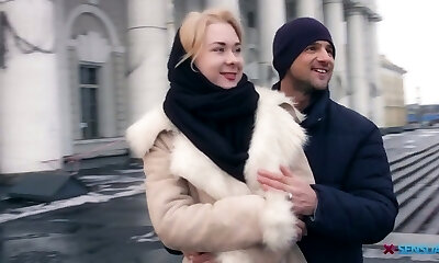 Appetizing babe displays her yummy donk in public and rides Nick Moreno's cock indoor