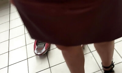 Hidden camera follows a brunette with great legs and short